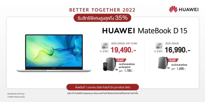 - HUAWEI MateBook D 15 (i3) 8GB+256GB ราคา 16,990 บาท รับฟรีทันที! กระเป๋าสะพายหัวเว่ยมูลค่า 1,090 บาท