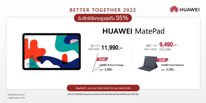 - HUAWEI MatePad (4G) 4GB+64GB ราคา 11,990 บาท ฟรี! HUAWEI M-Pencil มูลค่า 3,990 บาท