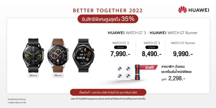 HUAWEI WATCH GT 3 Series สมาร์ทวอทช์ที่เป็นเสมือนเพื่อนคู่ใจตัวจริงของคนรักสุขภาพ มาพร้อมความสามารถในการตรวจวัดค่าทางสุขภาพ และฟีเจอร์จัดสรรการออกกำลังกายอัจฉริยะ อายุการใช้งานแบตเตอรี่ยาวนานถึง 14 วัน[4] รับฟรีทันทีสายนาฬิกาไนลอน และเครื่องชั่งน้ำหนักดิจิตอล HUAWEI Scale 3 รวมมูลค่าทั้งหมด 2,298 บาท เมื่อซื้อสมาร์ทวอทช์ 3 รุ่น ได้แก่