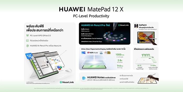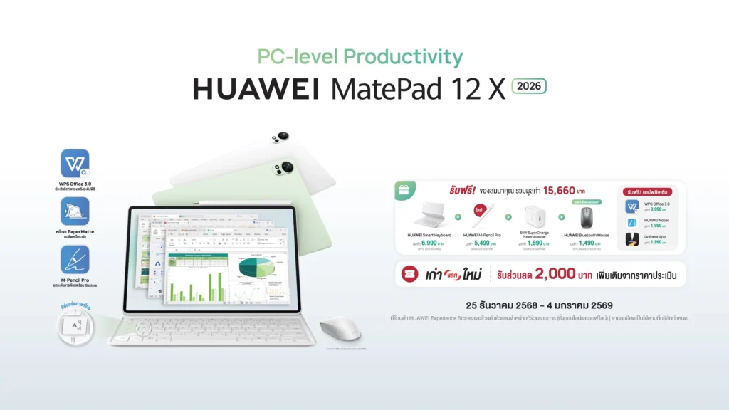อย่าพลาดเป็นเจ้าของHUAWEI MatePad 12X (2026) ได้โดยเมื่อพรีออเดอร์ระหว่างวันที่ 25 ธันวาคม 2568 ถึง 4 มกราคม 2569 พร้อมรับสิทธิประโยชน์สุดคุ้มด้วยของสมนาคุณมูลค่ารวมถึง 15,660 บาท ได้แก่ Huawei Smart Magnetic Keyboard มูลค่า 6,990 บาท HUAWEI M-Pencil Pro มูลค่า 5,490 บาท 66W SuperCharge Power Adapter มูลค่า 1,690 บาท HUAWEI Bluetooth Mouse มูลค่า 1,490 บาท พร้อมการติดตั้งแอปพลิเคชันฟรีได้แก่ PC-level WPS Office 3.0 มูลค่า 3,990 บาท HUAWEI Notes มูลค่า 1,990 และ GoPaint มูลค่า 1,990 บาท พร้อมส่วนลดเก่าแลกใหม่ 2,000 บาท