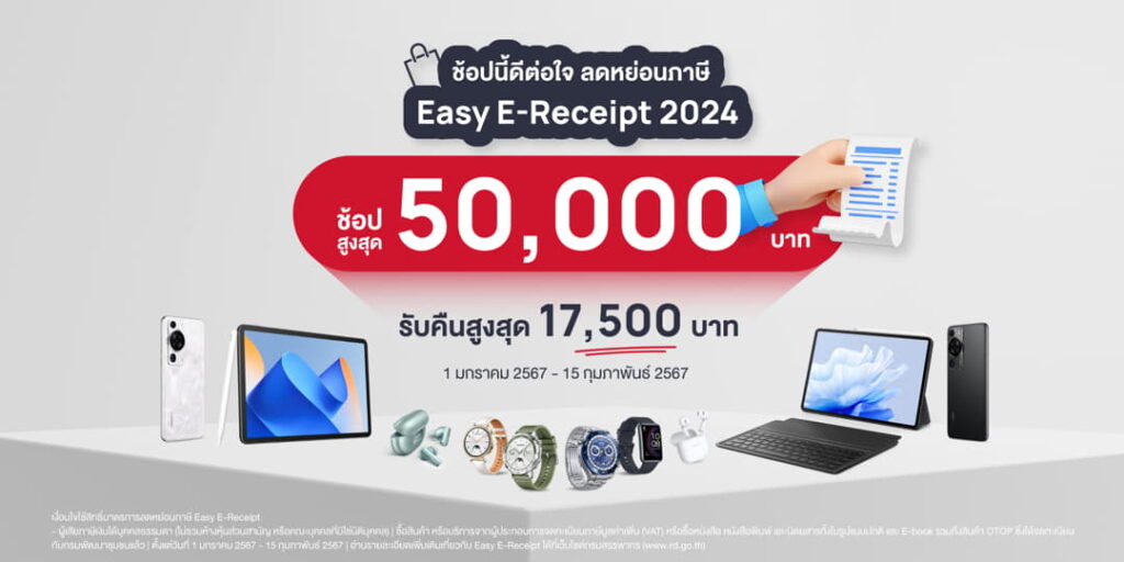 นอกจากนี้ผลิตภัณฑ์หัวเว่ยยังเข้าร่วมโครงการ “Easy E-Receipt 2024” ช้อปสูงสุด 50,000 บาท รับคืนสูงสุด 17.500 บาท