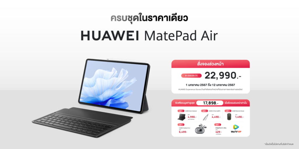 โดยลูกค้าสามารถพรีออเดอร์ได้ตั้งแต่วันที่ 1 มกราคม 2567 – 12 มกราคม 2567 รับทันที HUAWEI Smart Keyboard มูลค่า 4,990 บาท HUAWEI M-Pencil (รุ่นที่ 2) มูลค่า 4,490 บาท HUAWEI Bluetooth Mouse มูลค่า 1,490 บาท HUAWEI FreeBuds Pro 2 มูลค่า 6,499 บาท และ WeTV VIP 3 เดือน มูลค่า 429 บาท (100 สิทธิ์แรก)