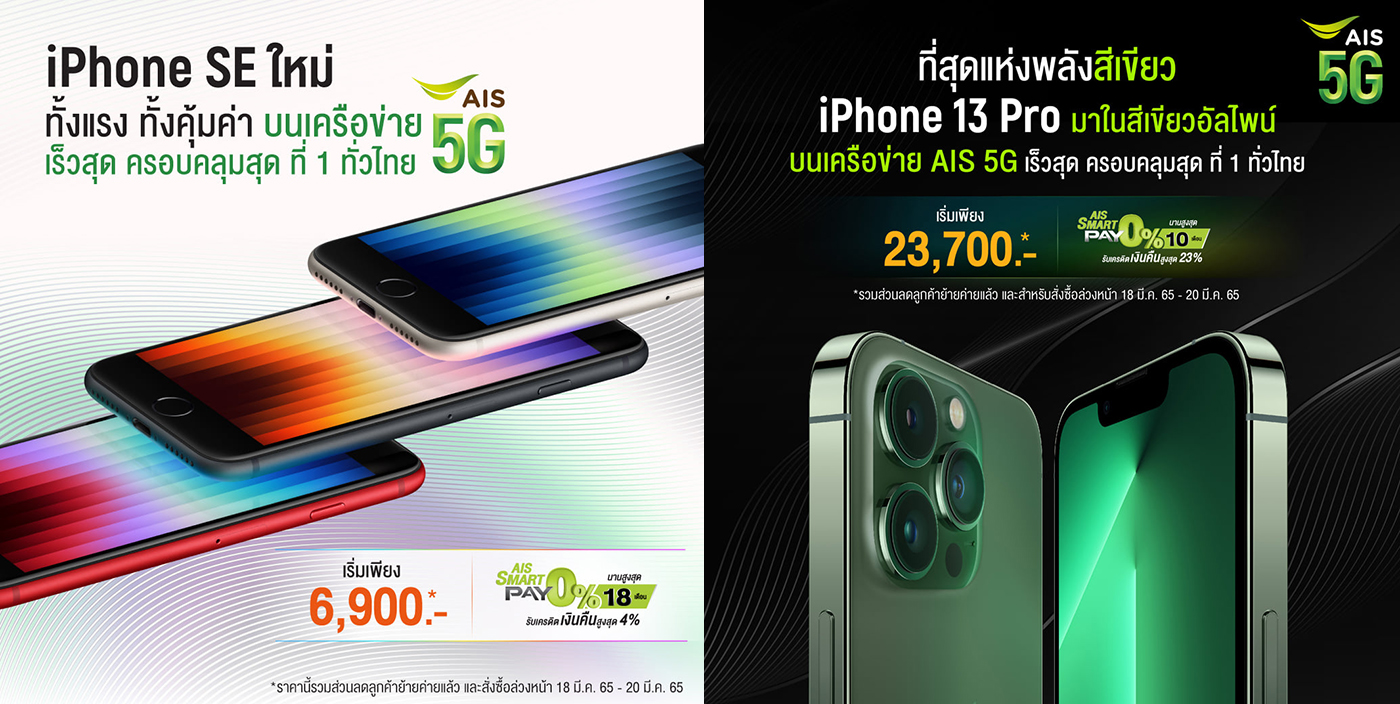 AIS 5G เตรียมวางจำหน่าย iPhone SE รุ่นใหม่ที่ทรงพลัง ในราคาที่เป็นเจ้าของได้ง่าย และ iPhone 13 Pro สีอัลไพน์กรีนที่สวยงาม และ iPhone 13 สีเขียวสะดุดตา