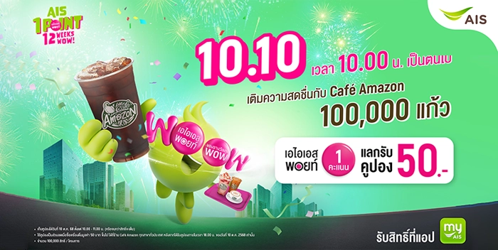 เอไอเอสตั้งใจมอบทุกเซอร์ไพรส์ความ WOW ให้ลูกค้าต่อเนื่องตลอดทั้งแคมเปญ และในวันที่ 10 ตุลาคม 2568 นี้ ขอมอบของขวัญความ WOW ครั้งใหญ่ ให้ลูกค้าใช้ AIS Points 1 คะแนน แลกรับฟรี! คูปองส่วนลดเครื่องดื่ม Café Amazon มูลค่า 50 บาท ได้เลยทันที วันเดียวเท่านั้น! ผ่านแอป myAIS ตั้งแต่เวลา 10.00 น. – 11.00 น. (หรือจนกว่าสิทธิ์จะเต็ม)
