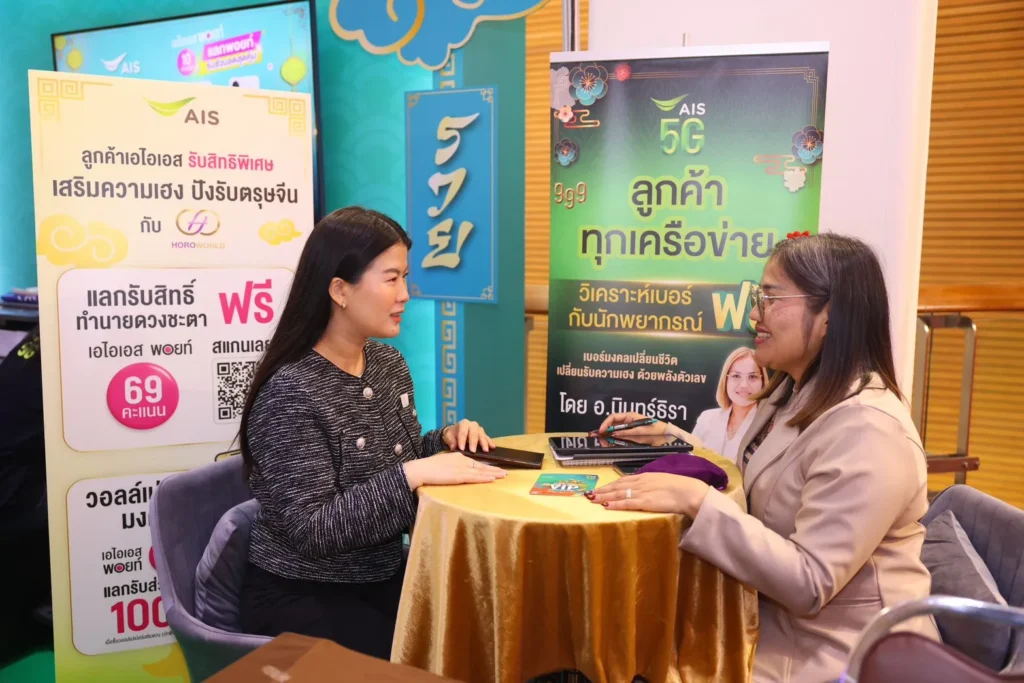 ภายในงานพบกับบรรยากาศเทศกาลตรุษจีนสุดคึกคัก และกิจกรรมเสริมความปังตลอดทั้งงาน สัมผัสประสบการณ์ความเฮงแบบครบวงจรที่บูธ AIS ไม่ว่าจะเป็น บริการเปิดซิมเบอร์มงคล พร้อมหมอดูผู้เชี่ยวชาญช่วยตรวจเช็กและทำนายความหมายเลขเบอร์โทรศัพท์ฟรี เสริมความมั่นใจและความเป็นสิริมงคลรับปีใหม่จีน หรือแลกรับของพรีเมียมคอลเลคชั่นสุดคิวท์ ด้วย AIS Points พร้อมให้แลกและรับสินค้าได้ทันที