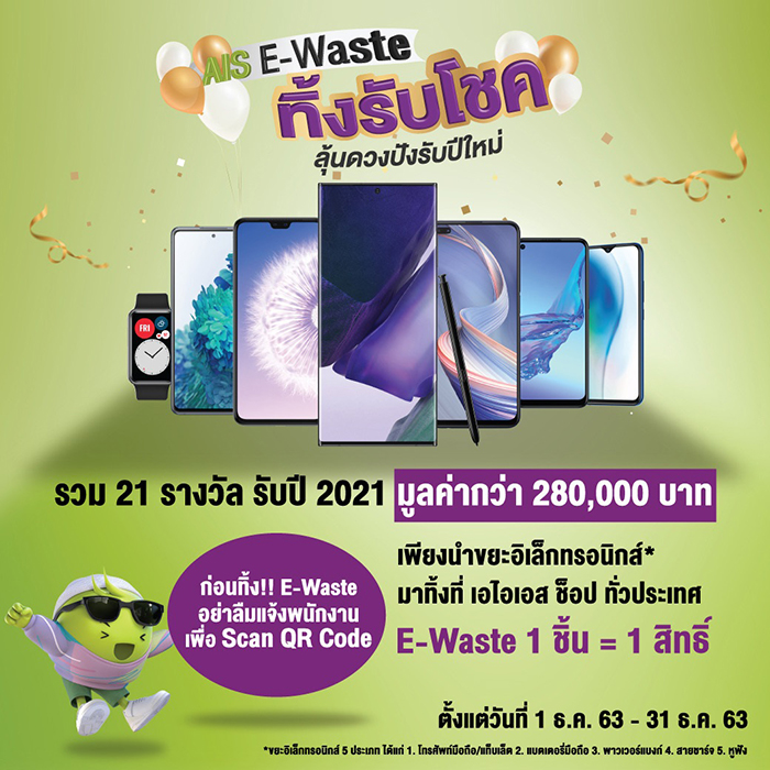 ดังนั้นจึงจัดกิจกรรม “AIS E-Waste ทิ้งรับโชค” เชิญชวนให้ลูกค้าเอไอเอส และ เอไอเอสไฟเบอร์ ลุ้นรับสมาร์ทโฟน 5G และรางวัลอื่นๆ รวม 21 รางวัล มูลค่ากว่า 280,000 บาท เพียงนำขยะอิเล็กทรอนิกส์ ทั้ง 5 ประเภท ได้แก่ 1. โทรศัพท์มือถือ/แท็บเล็ต 2. แบตเตอรี่มือถือ 3. พาวเวอร์แบงก์ 4. สายชาร์จ 5. หูฟัง มาทิ้งได้ที่ AIS Shop ทุกสาขาทั่วประเทศ ตั้งแต่วันนี้ – 31 ธันวาคม 2563 โดยขยะอิเล็กทรอนิกส์ 1 ชิ้น = 1 สิทธิ์ (1 หมายเลข/10สิทธิ์/โครงการ)