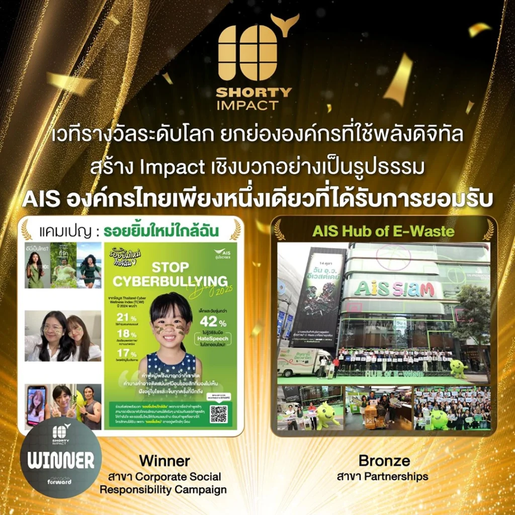 โดยเอไอเอสเป็นองค์กรจากประเทศไทยเพียงรายเดียวที่ได้รับรางวัลจากเวที 10th Annual Shorty Impact Awards 2025 ด้วยผลงานแคมเปญ “รอยยิ้มใหม่ใกล้ฉัน” ภายใต้โครงการอุ่นใจไซเบอร์ ที่ได้รับรางวัลระดับ Winner สาขา Corporate Social Responsibility Campaign และผลงาน AIS Hub of E-Waste ภายใต้โครงการ คนไทยไร้ E-Waste ที่ได้รับรางวัลระดับ Bronze สาขา Partnerships
