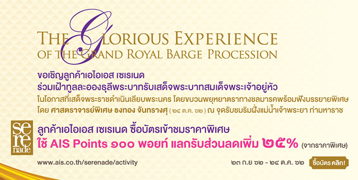 เอไอเอส เชิญชวนลูกค้าเซเรเนด ร่วมชมความวิจิตรงดงามของริ้วขบวนพยุหยาตราทางชลมารค เนื่องในพระราชพิธีบรมราชาภิเษก พุทธศักราช 2562 ณ จุดรับชมริมฝั่งแม่น้ำเจ้าพระยา ท่ามหาราช ในวันซ้อมใหญ่ วันจันทร์ที่ 21 ตุลาคม 2562 และวันเสด็จพระราชดำเนินเลียบพระนคร วันพฤหัสบดีที่ 24 ตุลาคม 2562