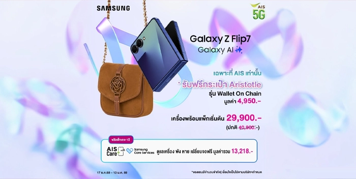 AIS ร่วมกับซัมซุง ผู้ผลิตสมาร์ทโฟนรายใหญ่ของโลก จัดโปรส่งความสุขท้ายปี 2025 พร้อมยกระดับสมาร์ทโฟน สู่แฟชั่นไอเทมสุดหรู เพียงซื้อสมาร์ทโฟนเรือธงระดับไฮเอนด์ที่ได้รับความนิยม Samsung Galaxy Z Flip7 รับฟรี! กระเป๋า Aristotle รุ่น Wallet on Chain หนัง Suede สีพิเศษ Light Brown มูลค่า 4,950 บาท ของขวัญสุดลิมิเต็ดเฉพาะลูกค้า AIS เท่านั้น
