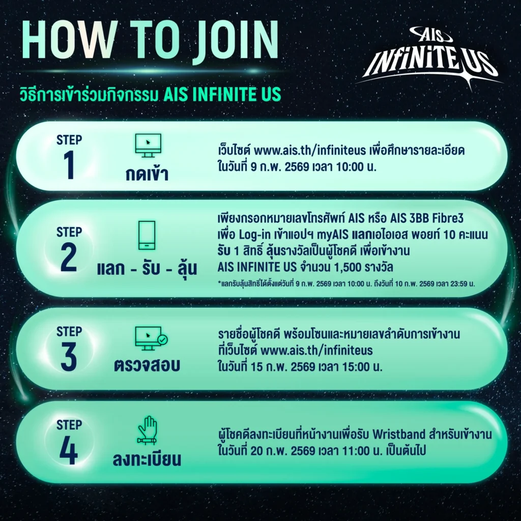 สิทธิพิเศษเฉพาะลูกค้าเอไอเอส เพียงใช้เอไอเอส พอยท์ 10 คะแนน เพื่อแลกรับ 1 สิทธิ์ลุ้นรางวัลเข้าร่วมงาน ผ่านแอปฯ myAIS ตั้งแต่วันที่ 9 กุมภาพันธ์ 2569 เวลา 10.00 น. – 10 กุมภาพันธ์ 2569 เวลา 23.59 น.