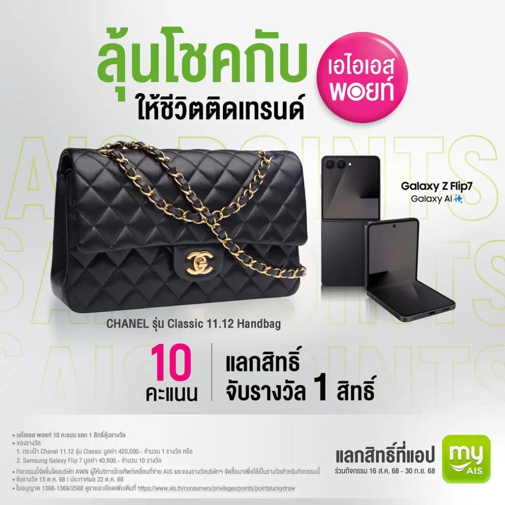 ลูกค้าสามารถลุ้นสิทธิ์เป็นเจ้าของสินค้าสุด Luxury ได้ตั้งแต่วันที่ 16 สิงหาคม – 30 กันยายน 2568 เพียงใช้ 10 เอไอเอส พอยท์ แลก 1 สิทธิ์ลุ้นรางวัล ผ่านแอป myAIS