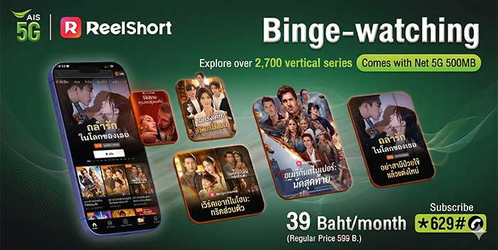 AIS 5G ตอกย้ำผู้นำโครงข่ายอัจฉริยะ ที่ตอบโจทย์ทุกดิจิทัลไลฟ์สไตล์ เดินหน้าเชื่อมต่อทั้งโครงข่ายและคอนเทนต์เข้าไว้ด้วยกันอย่างไร้รอยต่อ พร้อมบุกเบิกประสบการณ์ซีรีส์สั้นแนวตั้งในไทย ผ่านความร่วมมือกับ ReelShort แพลตฟอร์มซีรีส์สั้นแนวตั้งระดับโลก เพื่อส่งมอบประสบการณ์ความบันเทิงที่ตอบโจทย์ไลฟ์สไตล์ผู้บริโภคยุคดิจิทัล ด้วยคอนเทนต์ที่ดูง่าย จบไว และรับชมได้ทุกที่ทุกเวลา
