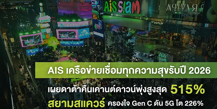 โดยเฉพาะแลนด์มาร์กที่สำคัญของกรุงเทพฯ ใจกลางเมือง สยามสแควร์ ซึ่งเป็นหนึ่งในพื้นที่จัดงานสำคัญ ที่ AIS ร่วมสร้างประสบการณ์เฉลิมฉลองผ่านเวที “SIAM SQUARE STREET OF DREAMZ 2026 presented by AIS SIAM” เปรียบเทียบการใช้งาน Data บนพื้นที่สยามสแควร์ ในวันที่ 31 ธ.ค. 68 กับปีที่แล้วพุ่งสูงขึ้นถึง 226% และแลนด์มาร์คสำคัญอย่างไอคอนสยาม ที่ AIS 5G Data ทะยายสูงขึ้นถึง 515%