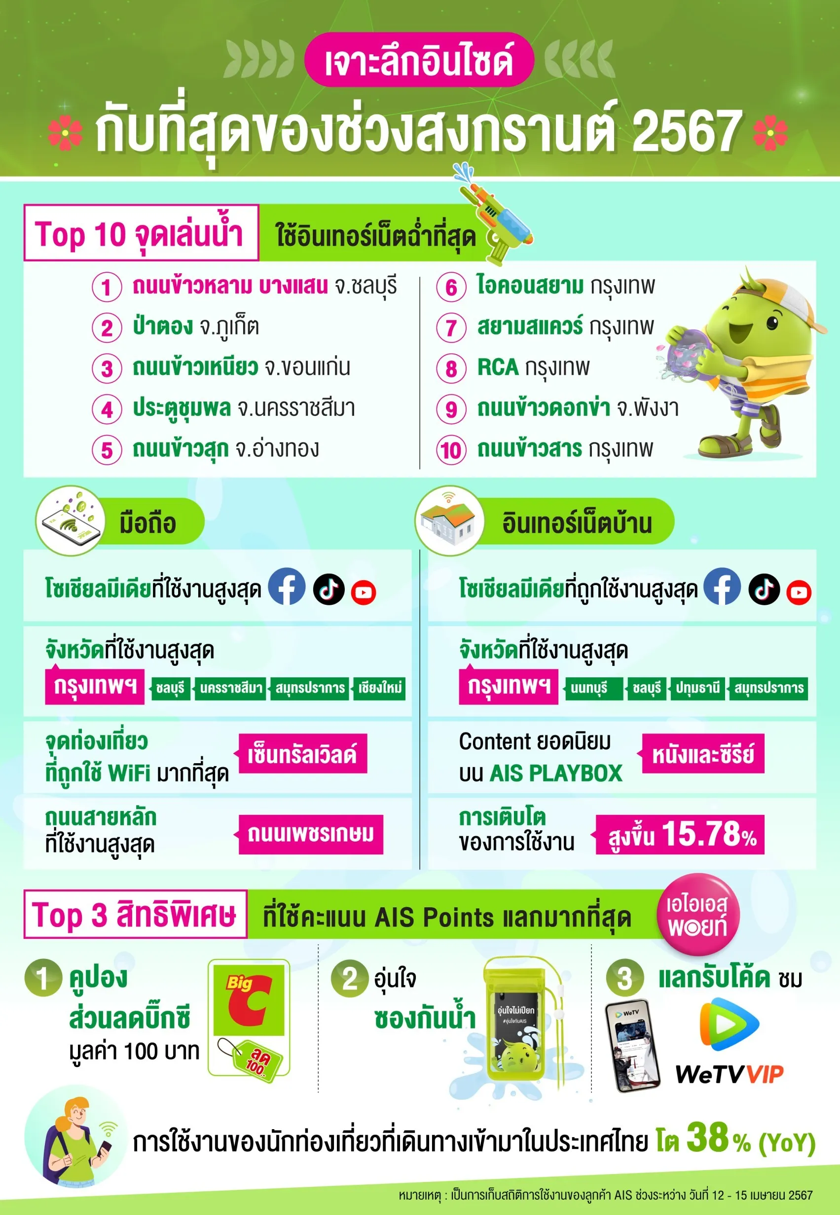 AIS เปิดพฤติกรรมการใช้งานช่วงเทศกาลสงกรานต์ ปี 2567 ของลูกค้าและคนไทย โดยได้จัดเต็มโครงข่าย ทั้งมือถือและเน็ตบ้านสาดสัญญาณฉ่ำตลอดเทศกาล ครอบคลุมโมเมนต์ความสุขทุกไลฟ์สไตล์การใช้ชีวิต