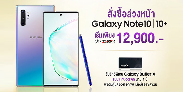 พิเศษ!! สำหรับลูกค้า AIS Serenade ที่สั่งซื้อล่วงหน้า Samsung Galaxy Note10 และ Note10+ จะได้รับบริการพิเศษ Galaxy Butler X บริการรับ-ส่งเครื่องซ่อมถึงบ้านฟรี รวมทั้งคุ้มครองจอภาพเพิ่มเติมหรณีรอยขีดข่วน และส่วนลดค่าซ่อม 50%
