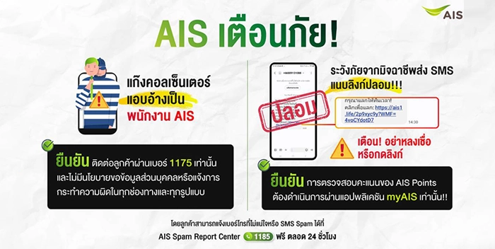 จากนั้นมิจฉาชีพจะหลอกว่า ต้องโอนสายไปยังเจ้าหน้าที่ตำรวจ เพื่อให้ดำเนินการเกี่ยวกับข้อมูลของลูกค้า เป็นต้นซึ่งถือเป็นจุดที่จะทำให้เกิดความเสี่ยงต่อลูกค้าทั้งในแง่การเปิดเผยข้อมูลส่วนบุคคล และ สูญเสียทรัพย์สินAIS จึงขอย้ำเตือนลูกค้าอย่าหลงเชื่อการแอบอ้างในลักษณะนี้ พร้อมยืนยันว่า บริษัทฯ จะติดต่อลูกค้าผ่านเบอร์ 1175 เท่านั้น และไม่มีนโยบายขอข้อมูลส่วนบุคคลหรือแจ้งการกระทำความผิดในทุกช่องทางและทุกรูปแบบ