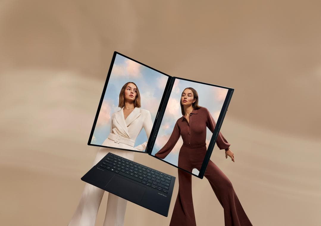 ผู้ใช้จะเพลิดเพลินไปกับจอแสดงผล ASUS Lumina OLED สองหน้าจอ ความคมชัดสูงสุดระดับ 3K 120Hzที่เชื่อมต่อกันด้วยบานพับ กางได้ 180องศา สามารถใช้งานได้ทั้งแนวตั้ง และแนวนอน ด้วยขาตั้งในตัวและคีย์บอร์ดที่ถอดแยกได้ ทำให้ใช้งานได้หลากหลายโหมด
