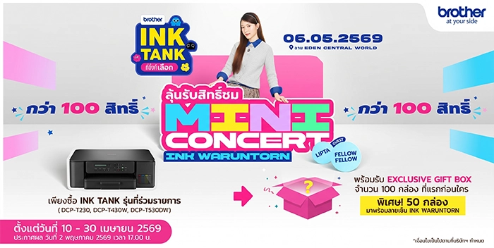 แล้วลงทะเบียนผลิตภัณฑ์ผ่าน Brother Club ก็มีสิทธิ์ลุ้นเป็นหนึ่งใน 100 ผู้โชคดี ไปร่วมสนุกในมินิคอนเสิร์ต อิ้งค์-วรันธร ท่ามกลางบรรยากาศอบอุ่นแบบใกล้ชิด พร้อมแขกรับเชิญอย่าง Lipta และ Fellow Fellow ที่จะมาร่วมเติมเต็มค่ำคืนให้พิเศษยิ่งขึ้น