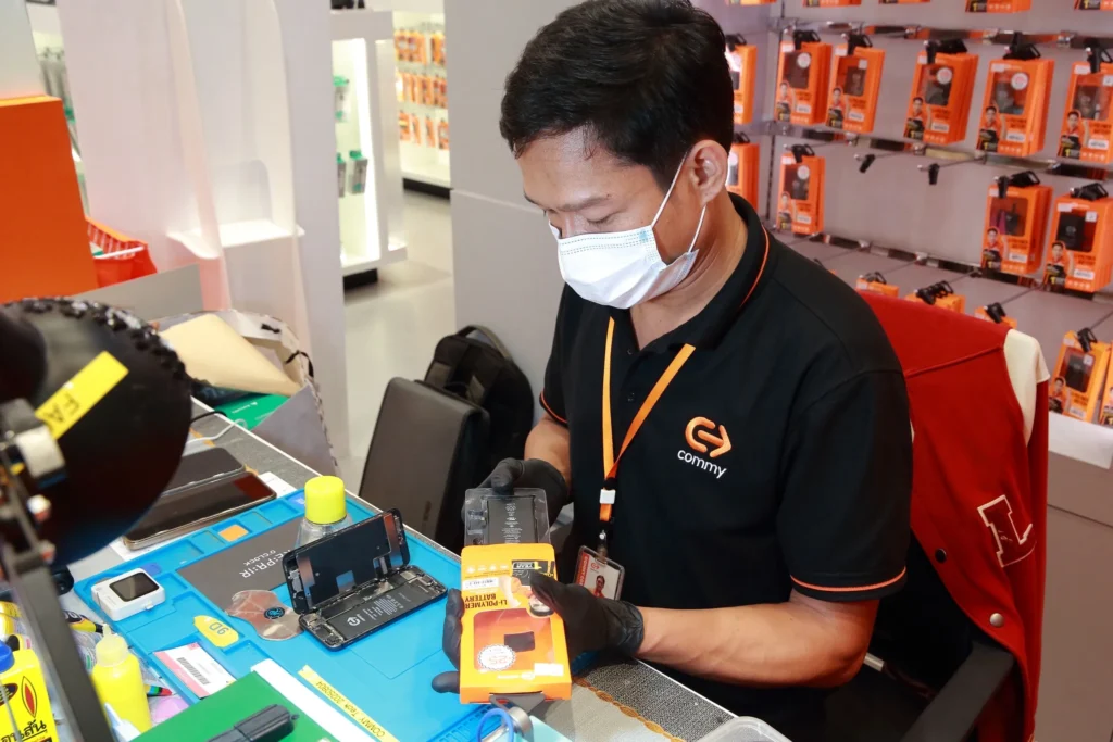 ส่วนรูปแบบการให้บริการ ลูกค้าสามารถเข้ามารับบริการได้ที่ Commy Care – Battery Service Center สำหรับการเปลี่ยนแบตเตอรี่ และจอสมาร์ทโฟน สามารถรับบริการเปลี่ยนทันที ใช้เวลาเพียง 30 นาที หรือสั่งซื้อผ่าน ร้านค้าออนไลน์อย่างเป็นทางการบนแพลตฟอร์ม Shopee, Lazada, และ TikTok และเข้ารับบริการติดตั้งได้ที่ร้าน โดยไม่มีค่าใช้จ่ายเพิ่มเติม ส่วนอะไหล่อิเล็กทรอนิกส์ที่เสียทางคอมมี่จะนำไปทำลายอย่างปลอดภัย เพื่อลดขยะอิเล็กทรอนิกส์ (E-waste) และช่วยดูแลสิ่งแวดล้อมอย่างยั่งยืน