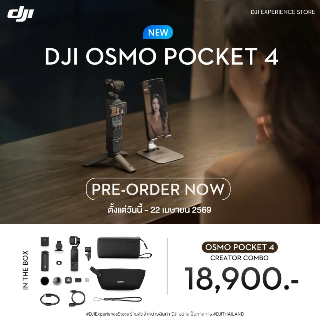 Osmo Pocket 4 พร้อมให้สั่ง Pre-order ที่ DJI Expereince Store และพาร์ทเนอร์ค้าปลีกที่ได้รับอนุญาต ตั้งแต่วันนี้เป็นต้นไป แล้วจะเริ่มวางขายจริงวันที่ 22 เมษายน 2569