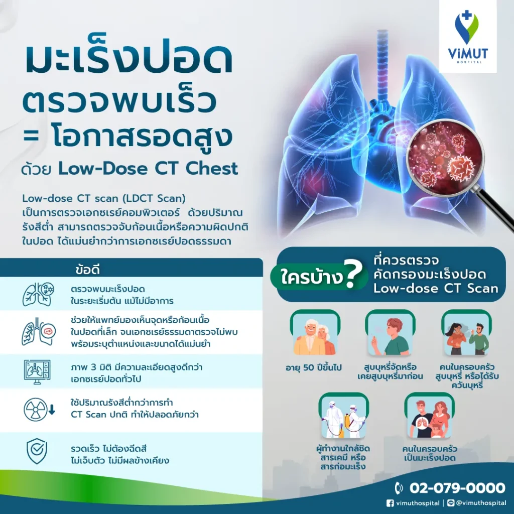 หากมีอาการผิดปกติ เช่น ไอเรื้อรัง หอบเหนื่อย เจ็บแน่นหน้าอก หรือมีเสมหะเรื้อรัง ควรรีบพบแพทย์ทันที และอย่าลืมตรวจสุขภาพปอดอย่างน้อยปีละหนึ่งครั้ง โดยเฉพาะในผู้ที่มีปัจจัยเสี่ยงสูง ควรพิจารณาการตรวจด้วย LDCT เพื่อเพิ่มโอกาสในการค้นพบความผิดปกติตั้งแต่เนิ่น ๆ และรับการดูแลอย่างเหมาะสม
