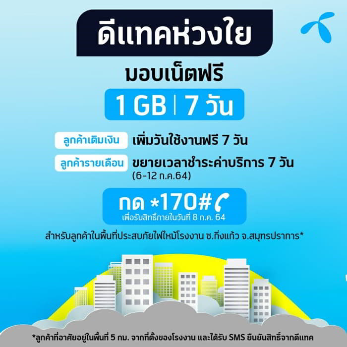 สำหรับลูกค้าดีแทคเติมเงิน – ลูกค้าดีแทคเติมเงินที่อาศัยในพื้นที่รัศมี 5 กิโลเมตร ดีแทคขอมอบเน็ตฟรี 1GB พร้อมขยายวันใช้งานเพิ่มเป็นจำนวน 7 วัน ระหว่าง 6-12 กรกฎาคม 2564