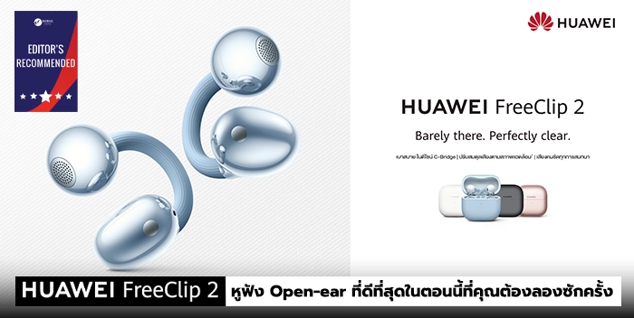 “HUAWEI FreeClip 2 กลับมาพร้อมดีไซน์ C-bridge ที่สวยพรีเมียมและกระชับขึ้น ใส่สบายเหมือนไม่ได้ใส่ เสียงอัปเกรดใหม่ให้เบสแน่นและมิติกว้างขึ้น พร้อมแบตที่อึดกว่าเดิม ถือเป็นตัวจบของสาย Open-ear ที่เน้นทั้งแฟชั่นและคุณภาพเสียงครับ”