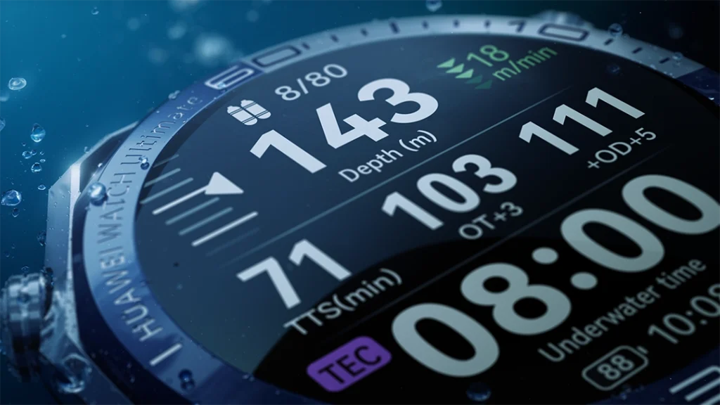 HUAWEI WATCH Ultimate 2 มีโหมดรองรับการดำน้ำ ทั้งการดำน้ำเพื่อพักผ่อนหย่อนใจ การดำน้ำแบบฟรีไดฟ์วิ่ง และการดำน้ำแบบเฉพาะทาง ผู้ใช้สามารถตั้งค่าออกซิเจนและประเภทของน่านน้ำ รวมไปถึงค่า PO2 สูงสุด ตั้งระยะเวลาที่ปลอดภัย เริ่มและหยุดโหมดดำน้ำได้อัตโนมัติ และยังแจ้งเตือนใต้น้ำได้อีกด้วย โดยหน้าจอจะแสดงผลต่างๆ ในระดับมืออาชีพ ไม่ว่าจะเป็นค่าความลึก ระยะเวลา ความเร็ว และค่าเฉพาะทางอย่าง NDL, PPO2, CNS, TTS, และ MOD