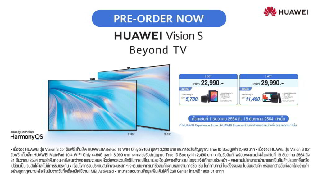 หากใครที่สนใจอยากจับจองเป็นเจ้าของ ในช่วงนี้ถือเป็นโอกาสดีที่ควรคว้าเอาไว้ เพราะหัวเว่ยจัดให้แบบใจป้ำกับข้อเสนอสุดเอ็กซ์คลูซีฟในช่วง Pre-order เมื่อสั่งจอง HUAWEI Vision S รุ่น 55 นิ้ว ราคา 22,990 บาท และรุ่น 65 นิ้ว ราคา 29,990 บาท ตั้งแต่วันที่ 1 ธันวาคม 2564 – 18 ธันวาคม 2564 ที่ HUAWEI Experience Store, HUAWEI Store และร้านค้าตัวแทนจำหน่ายที่ร่วมรายการเท่านั้น รับของสมนาคุณสุดคุ้มมูลค่าสูงสุด 11,480 บาท* ได้แก่ กล่องรับสัญญาณ True ID Box และ HUAWEI MatePad 4 GB + 64 GB