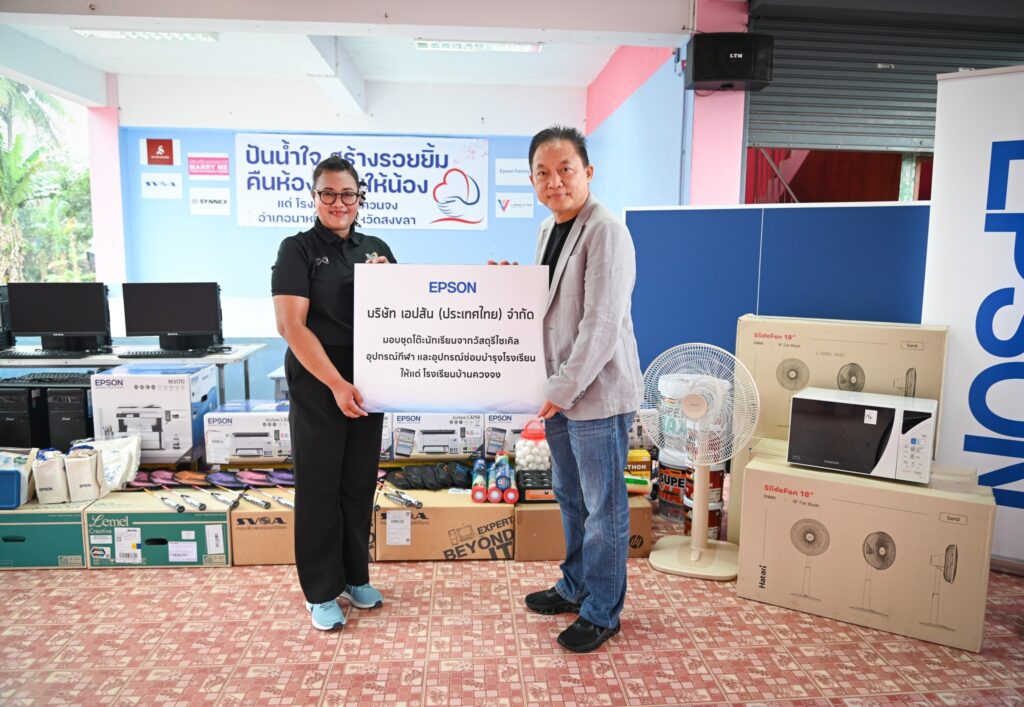 ซึ่งเอปสันได้มอบเครื่องพิมพ์ Epson EcoTank L3256 พร้อมชุดหมึก จำนวน 5 เครื่องให้ทั้ง 2 โรงเรียน และมอบเครื่องโปรเจคเตอร์ Epson EB-E24 รวมถึงชุดโต๊ะและเก้าอี้นักเรียนระดับประถมศึกษาที่ผลิตจากขวดหมึกรีไซเคิล จำนวน 60 ชุดให้กับโรงเรียนบ้านควนจง เพื่อสนับสนุนการเรียนการสอนของโรงเรียนบ้านควนจงอีกด้วย