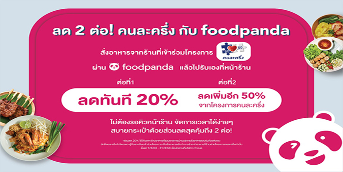 ฟู้ดแพนด้า ผู้นำด้านการให้บริการสั่งซื้อและจัดส่งอาหารเดลิเวอรี่ผ่านแอปพลิเคชัน ขอมอบส่วนลดสุดพิเศษให้กับลูกค้าในช่วงเว้นระยะห่างทางสังคมเพื่อควบคุมการแพร่ระบาดของโรคตั้งแต่ตอนนี้จนถึงสิ้นเดือนมีนาคมนี้ โดยมีร้านอาหาร เครื่องดื่ม และร้านของหวานหลากหลายประเภทที่เข้าร่วมโครงการคนละครึ่งทั่วประเทศที่พร้อมเข้าร่วมแคมเปญนี้ โดยลูกค้าของฟู้ดแพนด้าที่ลงทะเบียนเข้าร่วมโครงการคนละครึ่งและเลือกรับอาหารที่ร้านค้าด้วยตนเองสามารถสั่งอาหารจากร้านที่เข้าร่วมโครงการโดยรับส่วนลด 20% ของราคาอาหาร และเมื่อลูกค้าชำระค่าอาหารโดยใช้แอปพลิเคชันเป๋าตัง จะได้รับส่วนลดต่อที่ 2 โดยชำระค่าอาหารเพียง 50% ของราคาที่ต้องชำระจริง