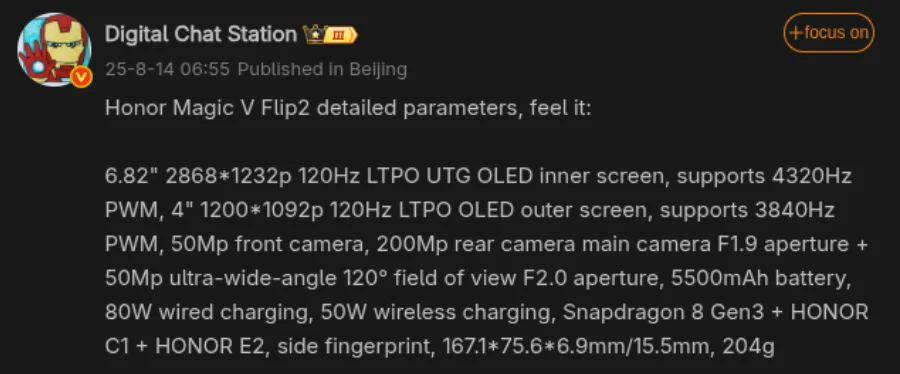 ตามข้อมูลสเปกเต็มที่หลุดออกมา Magic V Flip 2 มีขนาด 167.1 x 75.6 x 6.9 มม. เมื่อกางออก และหนา 15.5 มม. เมื่อพับเก็บ และมีน้ำหนัก 204 กรัม
