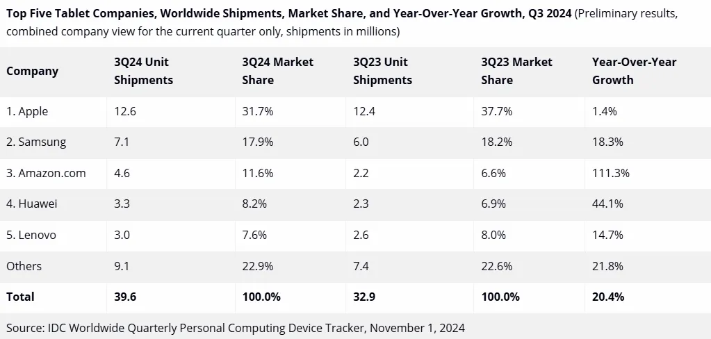 [3] ข้อมูลที่ได้รับจาก Canalys ตามรายงานของ HuaweiCentral ระบุว่า Huawei จัดส่งแท็บเล็ต 3.3 ล้านเครื่องในไตรมาสที่ 3 ปี 2024 ซึ่งเผยแพร่ในเดือนพฤศจิกายน 2024 https://www.canalys.com/newsroom/global-tablet-market-Q1-2024