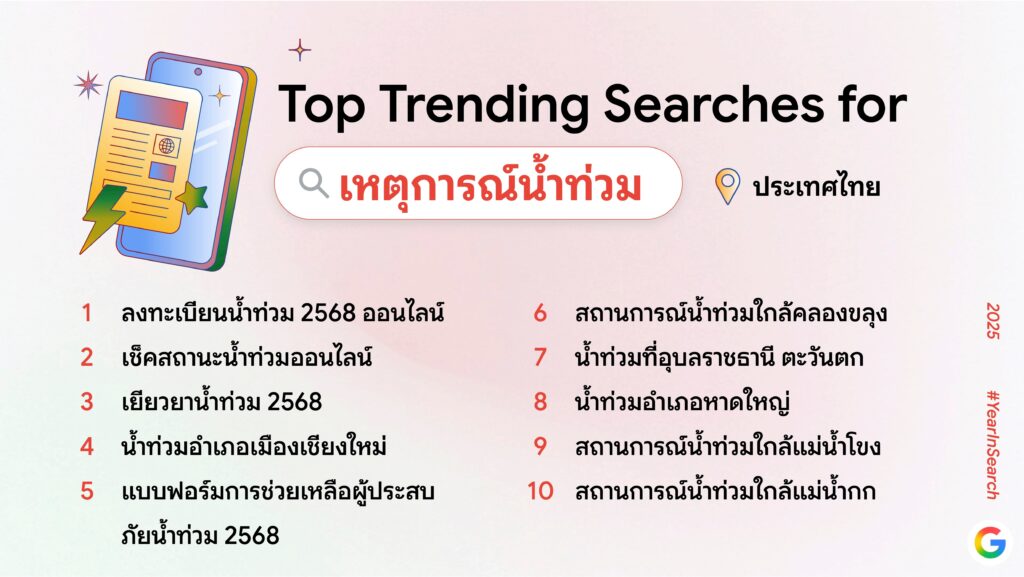 ตามด้วย “เช็คสถานะน้ำท่วมออนไลน์” “เยียวยาน้ำท่วม 2568” “น้ำท่วมอำเภอเมืองเชียงใหม่” “แบบฟอร์มการช่วยเหลือผู้ประสบภัยน้ำท่วม 2568” ในอันดับ 2- 5 ตามลำดับ และล่าสุด “น้ำท่วมอำเภอหาดใหญ่” ซึ่งเป็นเหตุการณ์ที่เกิดขึ้นได้ไม่นาน ก็พุ่งขึ้นมาติดโผใน 10 อันดับแรกอย่างรวดเร็ว