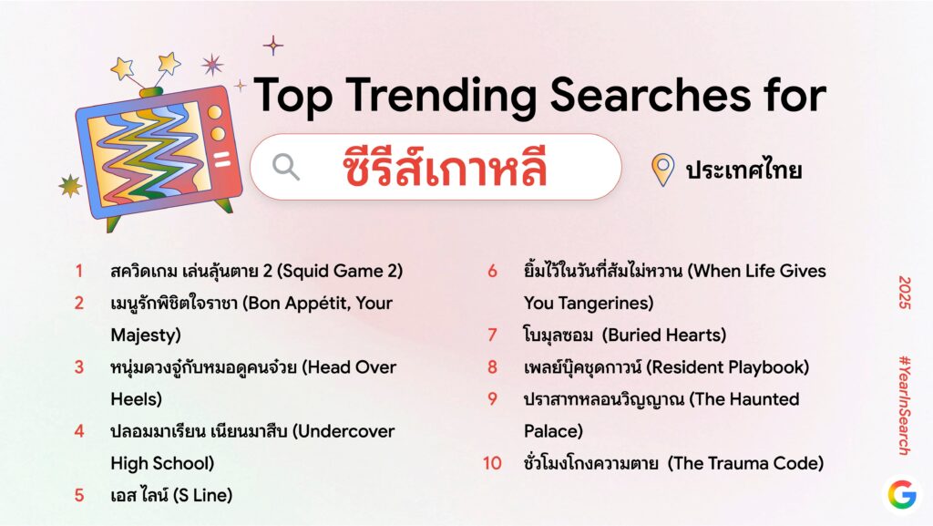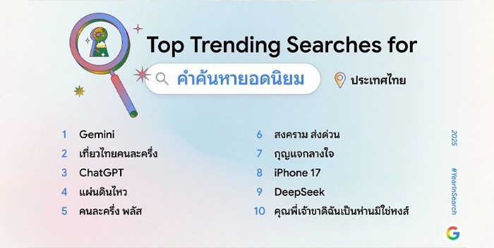 Google ประเทศไทย เผยผล “Year in Search 2025” รายงานสรุปคำค้นหายอดนิยมประจำปีที่สะท้อนภาพรวมความสนใจของคนไทยตลอดปี 2568 ไม่ว่าจะเป็นเหตุการณ์สำคัญที่เป็นกระแส เทรนด์ AI ที่มาแรงต่อเนื่อง บุคคลและข่าวเด่นที่ถูกพูดถึงทั่วประเทศ