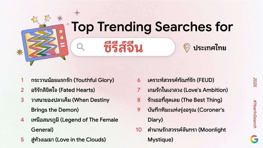 Year in Search ไม่เพียงสะท้อนภาพรวมความสนใจของคนไทยในปี 2568 แต่ยังรวบรวมคำค้นหายอดนิยมที่ชี้ให้เห็นกระแสระดับโลกด้วย สามารถดูข้อมูลเชิงลึกของเทรนด์การค้นหาในไทยและต่างประเทศได้ที่ https://yearinsearch.google/ (หมายเหตุ: สามารถเข้าลิงก์ได้ตั้งแต่วันที่ 4 ธันวาคม 2568 เวลา 15.00 น. เป็นต้นไป)