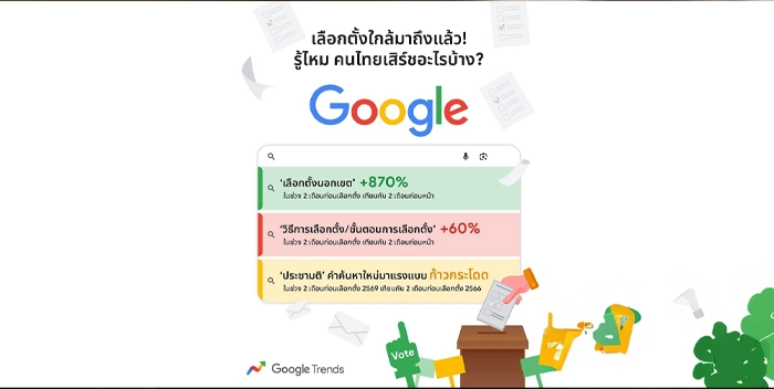 Google Trends เผยพฤติกรรมการค้นหาของคนไทยในช่วงก่อนการเลือกตั้งปี 2569 ซึ่งสะท้อนถึงความสนใจทางการเมืองของคนไทย โดยเฉพาะคำค้นหาที่เกี่ยวข้องกับกระบวนการเลือกตั้งในหลากหลายมิติ