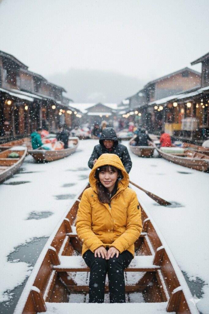 - สร้างรูปภาพจากรูปภาพอ้างอิง ใส่ชุดกันหนาวสีเหลืองแบบฮู้ด ภาพมุมกว้างนั่งอยู่ในเรือที่ตลาดน้ำที่กำลังมีคนพายเรือ หิมะกำลังตก ผิวน้ำของแม่น้ำเป็นน้ำแข็งบางๆ