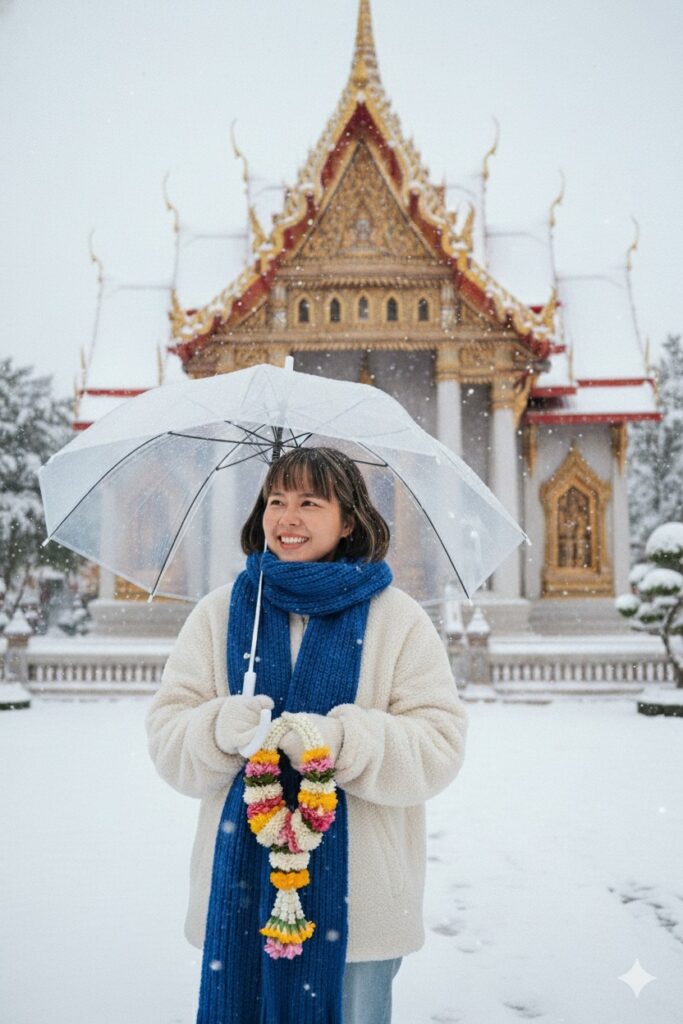 - สร้างรูปภาพจากรูปภาพอ้างอิง กำลังยิ้ม ถือร่มสีใส และพวงมาลัยดอกไม้ ใส่ชุดกันหนาวสีขาว ผ้าพันคอสีน้ำเงิน ยืนอยู่หน้าวัดที่มีหิมะปกคุลม