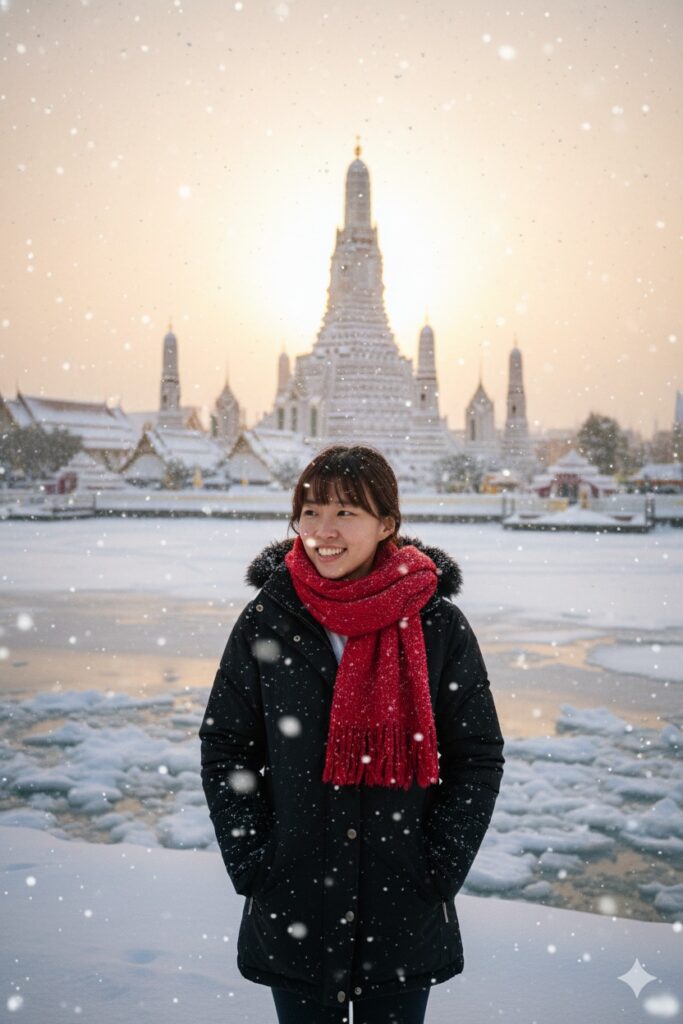 - สร้างรูปภาพจากรูปภาพอ้างอิง ใส่ชุดกันหนาวสีดำ ผ้าพันคอสีแดง ฉากหลังเป็นวัดอรุณราชวรารามราชวรมหาวิหาร และแม่น้ำเจ้าพระยา มีแสงพระอาทิตย์ด้านหลัง เต็มไปด้วยหิมะ