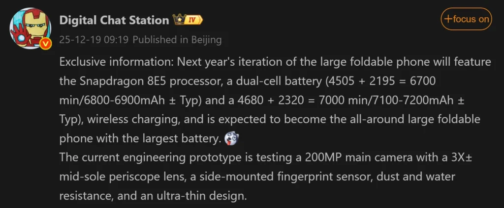 เมื่อเทียบกับรุ่นปัจจุบันอย่าง Magic V5 ที่มีแบตเตอรี่สูงสุด 6,100mAh ถือว่าเป็นการก้าวกระโดดครั้งใหญ่ หากข้อมูลนี้เป็นจริง HONOR Magic V6 อาจกลายเป็นมือถือจอพับที่มีแบตเตอรี่ใหญ่ที่สุดในตลาด โดยยังคงรักษาดีไซน์ที่บางเบาและรองรับ Wireless Charging ไว้ได้