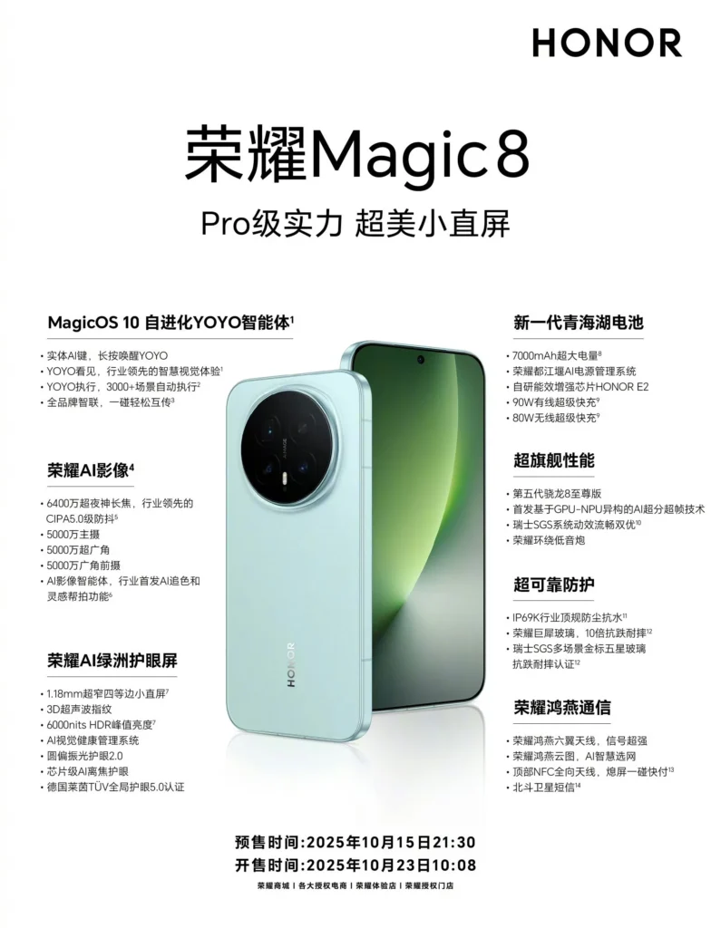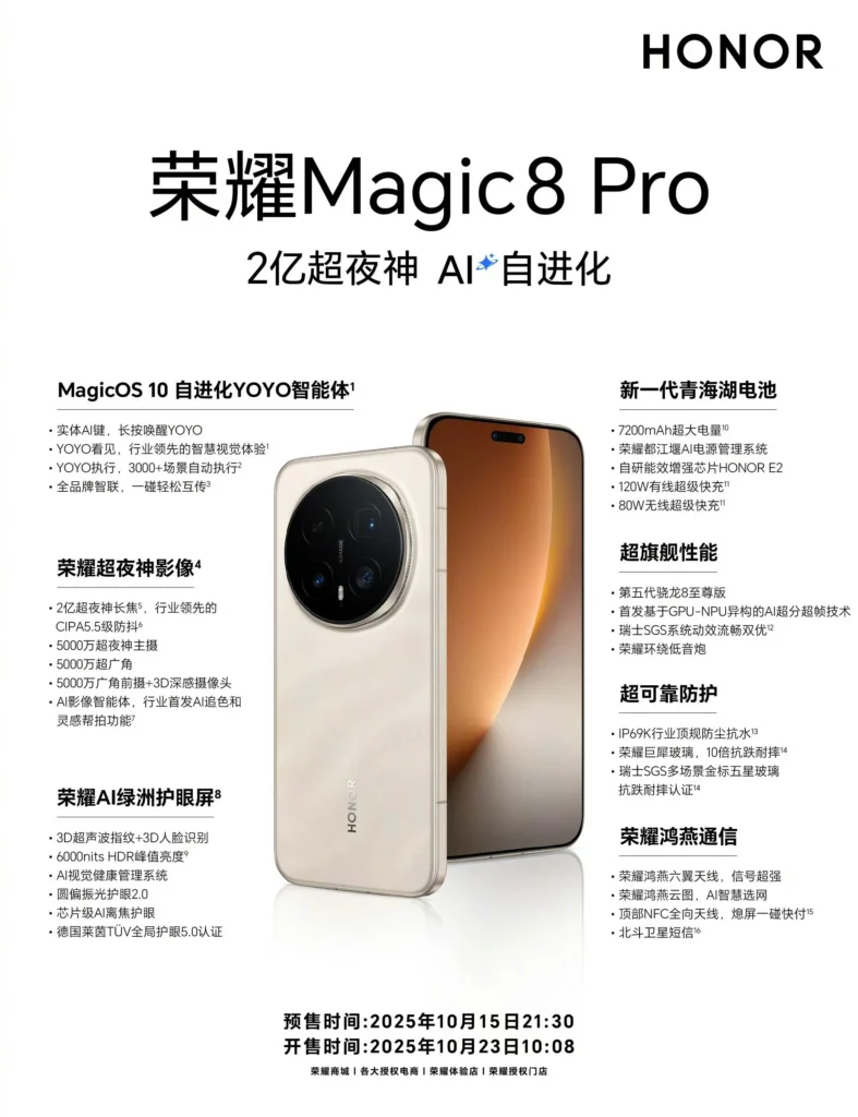 HONOR Magic8 Pro ยังได้รับมาตรฐานกันน้ำกันฝุ่นระดับ IP68/IP69/IP69K มีให้เลือก 3 สี ได้แก่ Sunrise Gold, Sky Cyan และ Black ตัวเครื่องมีความหนา 8.4 มม. และน้ำหนัก 213 กรัม