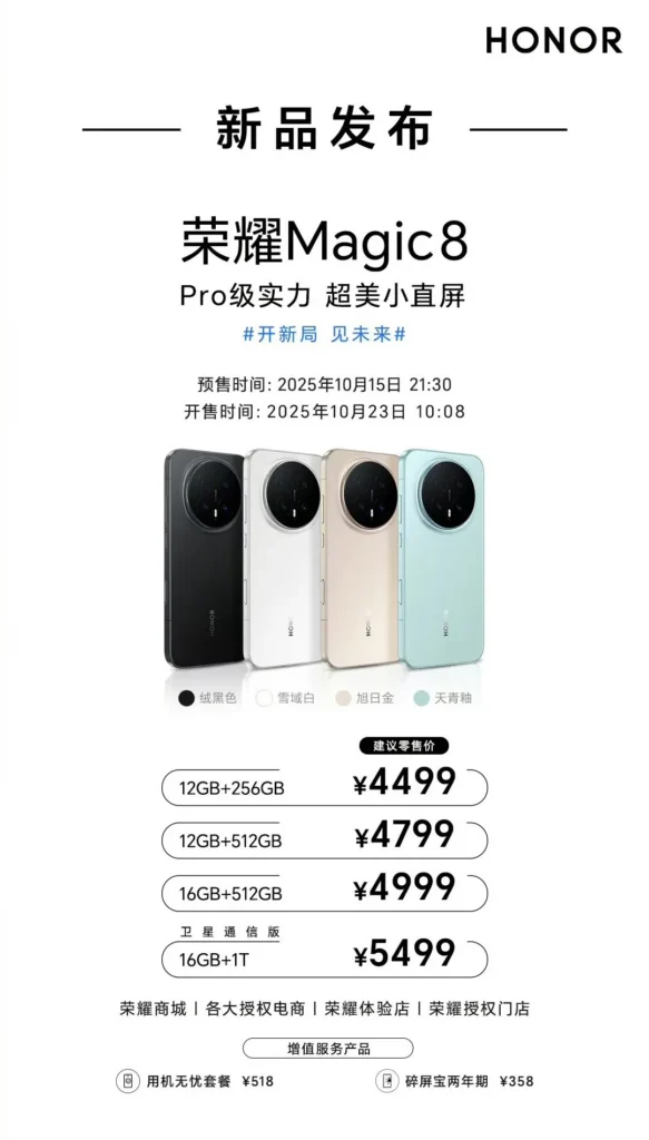 HONOR Magic8 Series เริ่มเปิดให้สั่งจองล่วงหน้า (Pre-order) แล้วในประเทศจีน และจะเริ่มวางจำหน่ายอย่างเป็นทางการในวันที่ 23 ตุลาคมนี้ โดยมีราคาดังนี้