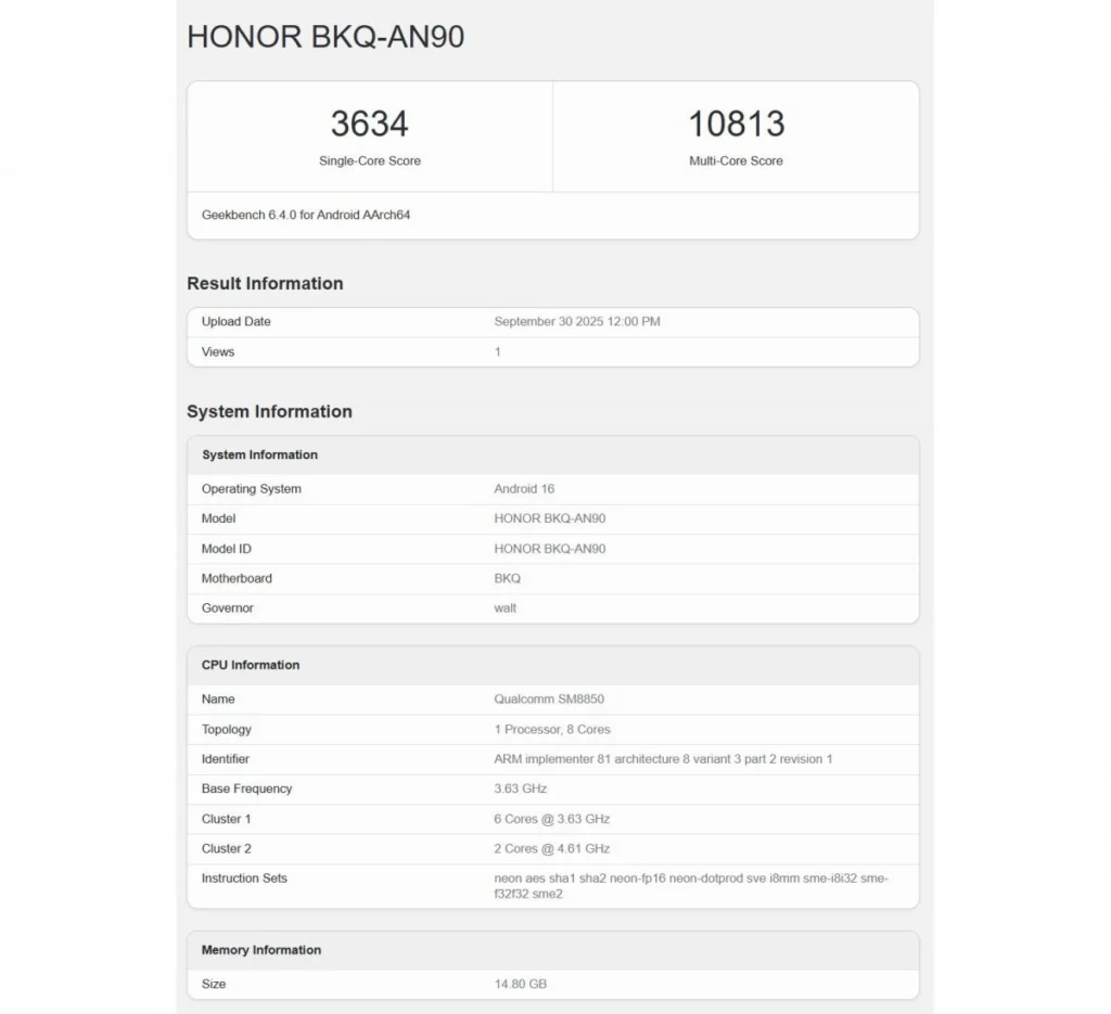 ล่าสุด ดูเหมือนว่าสมาร์ทโฟนรุ่นนี้ได้ปรากฏตัวบนแพลตฟอร์มทดสอบประสิทธิภาพอย่าง Geekbench เป็นที่เรียบร้อย โดยใช้หมายเลขโมเดล BKQ-AN90 ซึ่งตรงกับข่าวลือที่ว่าเป็นของ HONOR Magic8 Pro