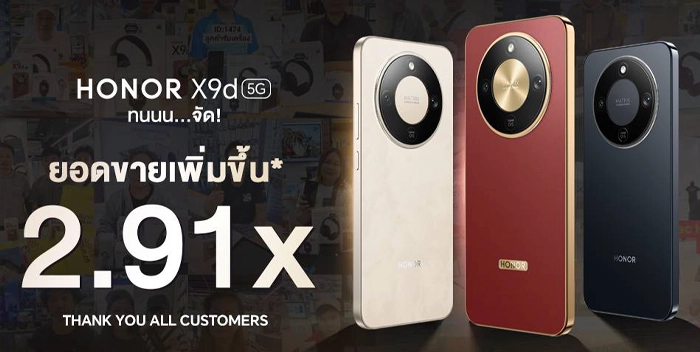 ออเนอร์ (HONOR) ผู้ให้บริการอุปกรณ์อัจฉริยะชั้นนำระดับโลก ประกาศความสำเร็จล่าสุดกับสมาร์ตโฟนรุ่นใหม่ ‘HONOR X9d 5G’ ที่สร้างปรากฏการณ์ใหม่ในตลาดสมาร์ตโฟนไทย ด้วยสถิติยอดขายเติบโตอย่างก้าวกระโดด เพิ่มขึ้นถึง 2.91 เท่า! เมื่อเทียบกับรุ่นก่อนหน้าในวันแรกของการวางจำหน่าย สะท้อนความเชื่อมั่นของผู้บริโภคที่มีต่อแบรนด์ ทั้งในด้านนวัตกรรมความทนทานและคุ้มค่า