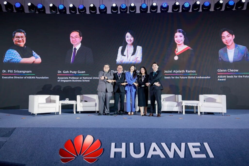 ผู้ร่วมเสวนา: ดร. ปิติ ศรีแสงนาม ผู้อำนวยการบริหารมูลนิธิอาเซียน, ดร. โก๊ะ ป๋วย กวน รองศาสตราจารย์จากมหาวิทยาลัยธุรกิจ มหาวิทยาลัยแห่งชาติสิงคโปร์, นางสาวจีซีล ไอเจเลธ รามอส แอมบาสเดอร์ระดับโลกของโครงการ Seeds for the Future, นางสาวธัญญ์ฐิตา อนันต์จารุเลิศ ผู้จัดการอาวุโสฝ่ายการตลาด 5Gและแอมบาสเดอร์ภูมิภาคเอเชียแปซิฟิกของหัวเว่ย, นายเกล็นน์ โชว, ผู้คว้ารางวัลผู้นำ Seeds for the Future 2023 (จากซ้ายไปขวา)
