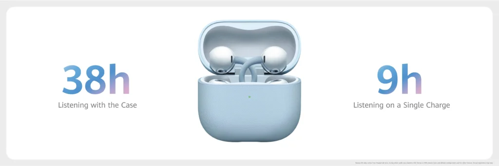 [1] ข้อมูลอายุการใช้งานแบตเตอรี่มาจากการทดสอบในห้องปฏิบัติการของหัวเว่ย โดยทำการเชื่อมต่อหูฟังกับโทรศัพท์ HUAWEI Pura 70 ที่ใช้ระบบ EMUI 14.2.0 เปิดเพลงที่ระดับความดัง 50% ในรูปแบบไฟล์เสียง AAC และตั้งค่าฟังก์ชันอื่น ๆ ไว้ที่ค่าเริ่มต้น ผลการใช้งานจริงอาจแตกต่างกันไปขึ้นอยู่กับระดับความดัง แหล่งที่มาของเสียง สภาพแวดล้อมที่มีสัญญาณรบกวน ฟีเจอร์ของผลิตภัณฑ์ และลักษณะการใช้งานของผู้ใช้