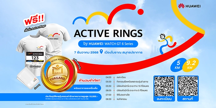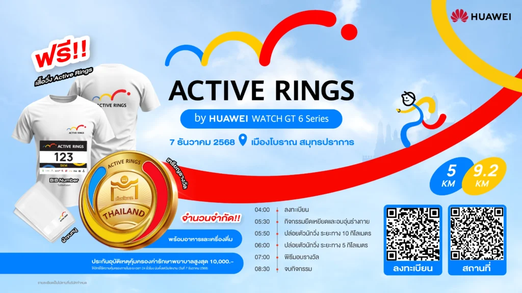 HUAWEI WATCH GT 6 Series ขอเชิญสาวกสุขภาพและผู้รักการวิ่งทุกท่าน เข้าร่วมกิจกรรม “Active Rings by HUAWEI Watch GT 6 Series” ที่จะจัดขึ้นวันที่ 7 ธันวาคม 2568 ณ เมืองโบราณ สมุทรปราการ หนึ่งในแหล่งท่องเที่ยวด้านศิลปวัฒนธรรมของไทย ภายใต้แนวคิด ‘Health Forward’ ที่มุ่งเน้นการผสานเทคโนโลยีสวมใส่ (wearables) กับการดูแลสุขภาพเชิงลึก เพื่อให้การวิ่งไม่ใช่แค่การออกกำลังกาย แต่เป็นการเดินทางแห่งแรงบันดาลใจในทุกก้าว