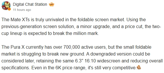 ช่วงเวลานี้ดูเหมือนจะเป็นจังหวะที่ดีสำหรับ HUAWEI โดยมีข้อมูลว่า Mate XTs มือถือจอพับ 3 ทบของบริษัท กำลังจะมียอดผู้ใช้งานทะลุ 1 ล้านคน เนื่องจากการปรับปรุงอย่างต่อเนื่องและราคาเปิดตัวที่ต่ำลง นอกจากนี้ยังมีข่าวลือว่า Apple กำลังเตรียมเปิดตัว iPhone Fold ที่อาจมีอัตราส่วนจอกว้างใกล้เคียงกัน การตัดสินใจของ HUAWEI ที่จะเดินหน้าต่อกับ Pura X Series จึงชี้ให้เห็นว่าบริษัทมองว่าดีไซน์รูปแบบนี้คือการเดิมพันที่มั่นคง