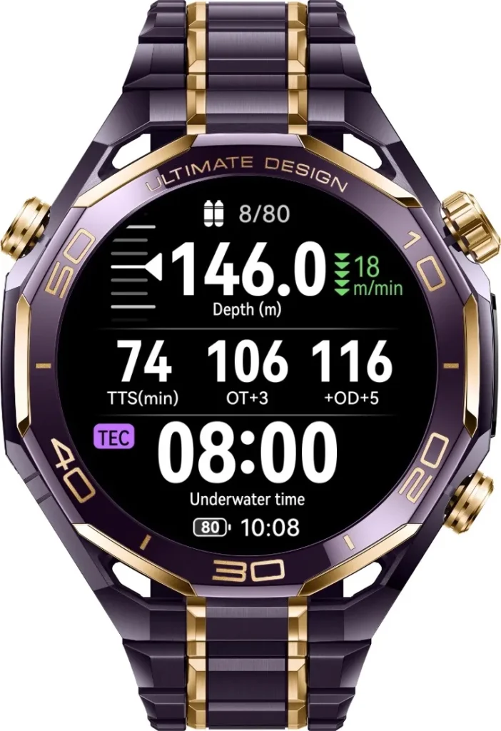 HUAWEI WATCH ULTIMATE DESIGN Royal Gold Edition มาพร้อมระบบกันน้ำใหม่ที่ยังคงฟังก์ชันเสียงสำหรับการใช้งานในชีวิตประจำวัน แต่สามารถรองรับการดำน้ำได้ลึกถึง 150 เมตร[3] ซึ่งเป็นมาตรฐานระดับนักดำน้ำมืออาชีพ